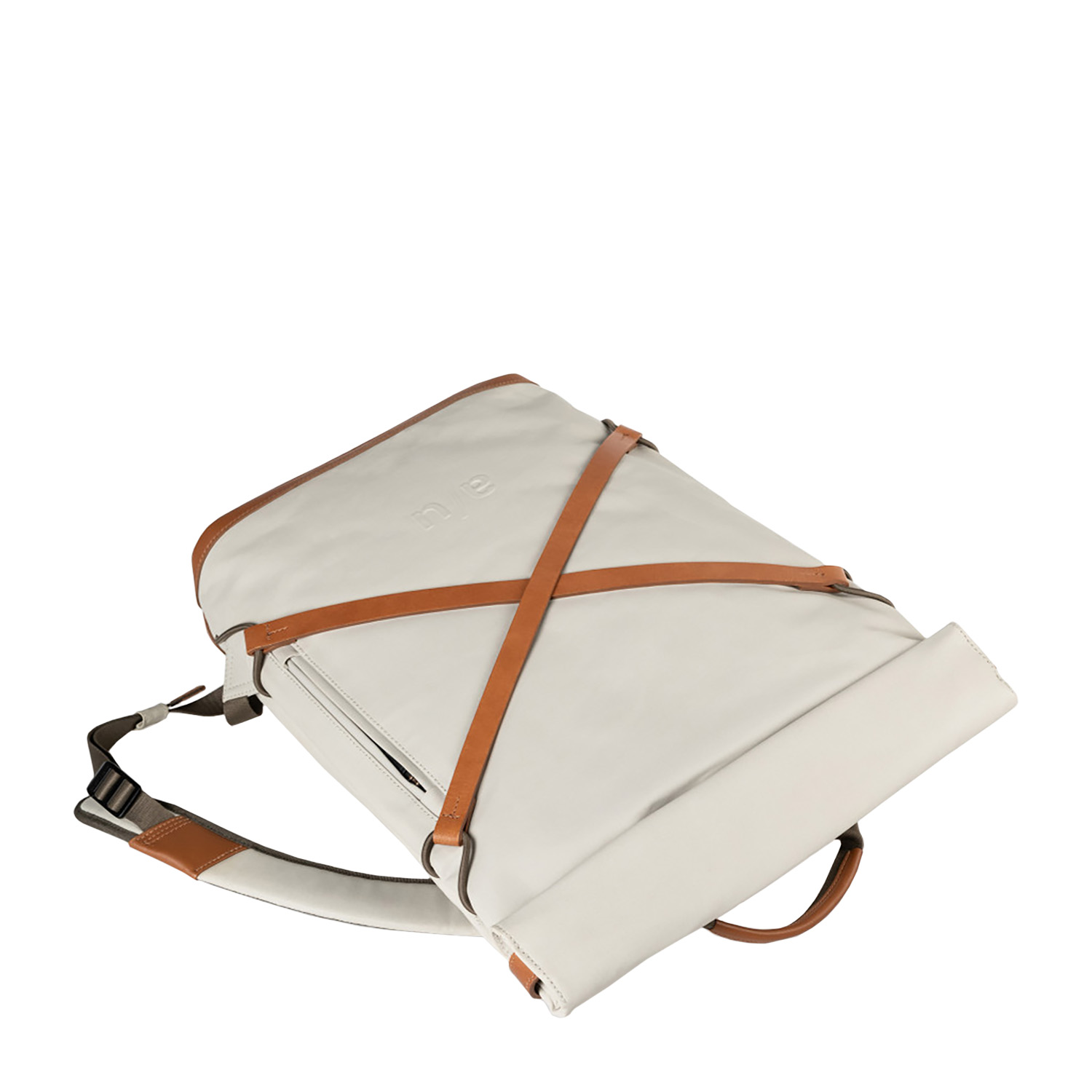 Das Hauptfach schließt mit dem Rollverschluss und Druckknöpfen und beinhaltet ein gepolstertes Tabletfach, ein großes Reißverschlussfach, ein Steckfach, ein Handyfach und zwei Schlaufen für Stifte. Der lederne Boden ist verstärkt. Außen hat der Osaka ein großes, wasserdichtes Reißverschlussfach an der Oberseite, sowie je ein wasserdichtes Reißverschlussfach auf der Vorder- und auf der Rückseite.